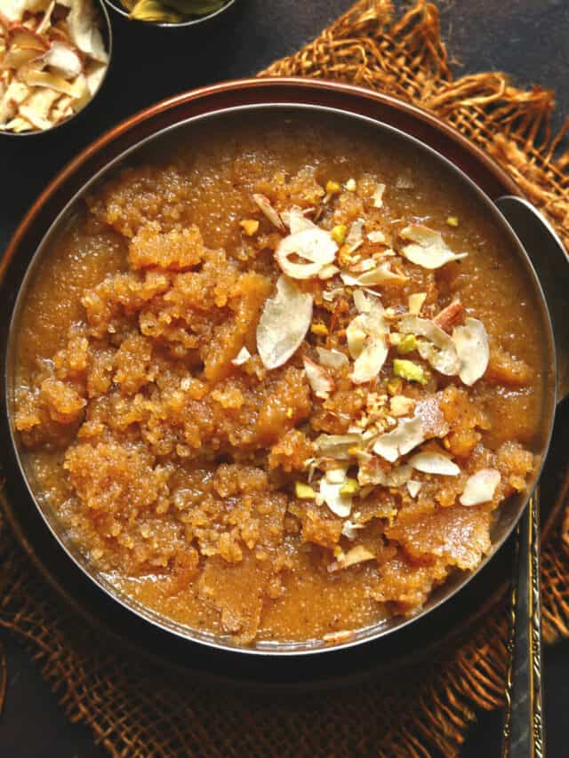 Transfer the halwa into a bowl and garnish with more nuts and dry fruits.