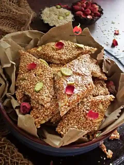 Sesame seeds and jaggery are cooked together in ghee, flattened in thin disc shape and cooled down before storing. It is a perfect bite-sized treat during Lohri.