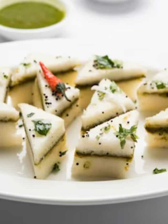 Dhokla without onion and garlic is light, fluffy, and ideal for Navratri fasting. Made with gram flour, yoghurt, and mild spices, it is steamed to perfection and topped with a simple tempering.