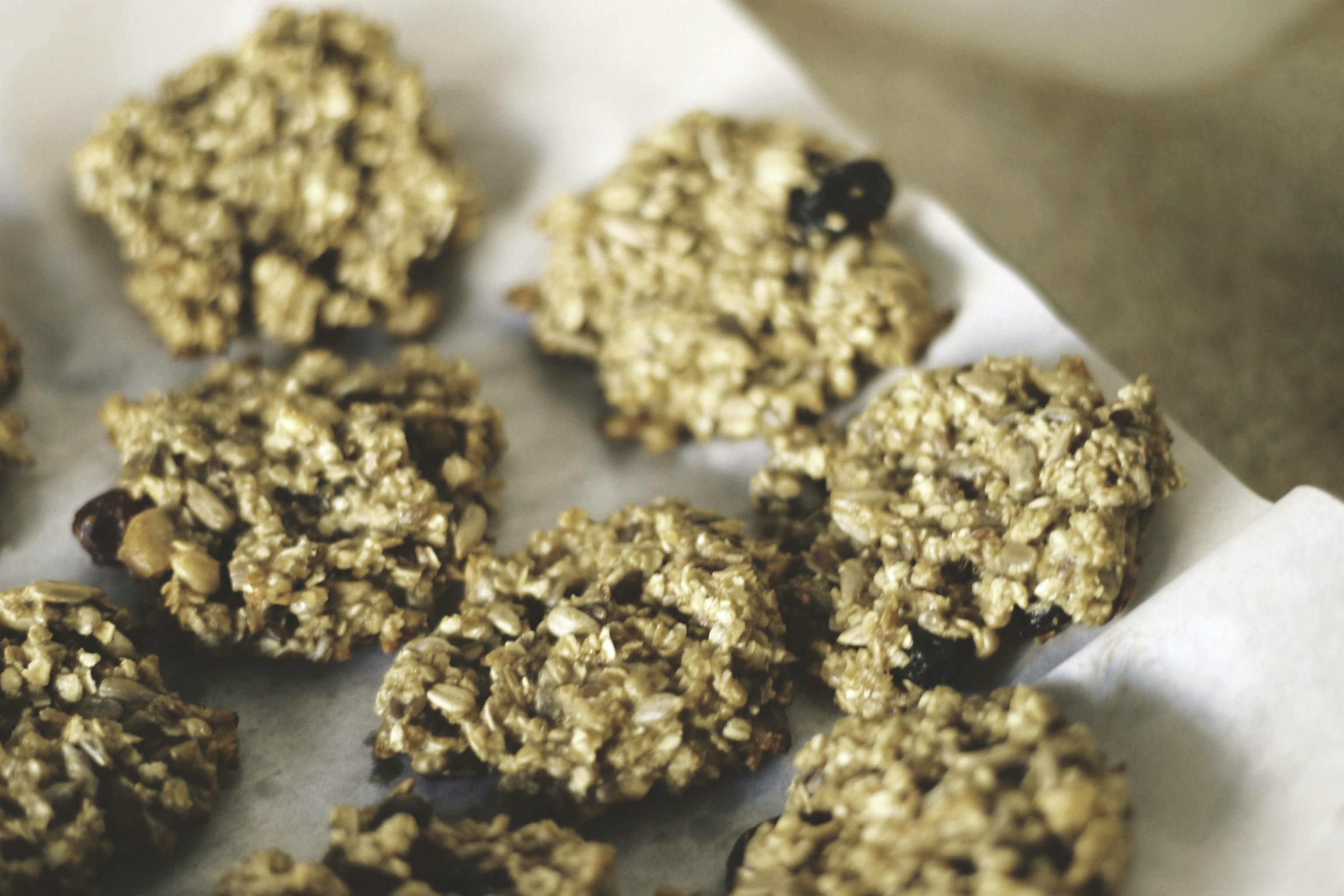 1.5 cups rolled oats 1/2 cup maida 1 teaspoon baking powder 1/2 teaspoon ground cinnamon 1/4 teaspoon salt 1/2 cup mashed banana 1/4 cup coconut oil 1/3 cup honey or maple syrup 1 teaspoon vanilla extract 1/2 cup raisins