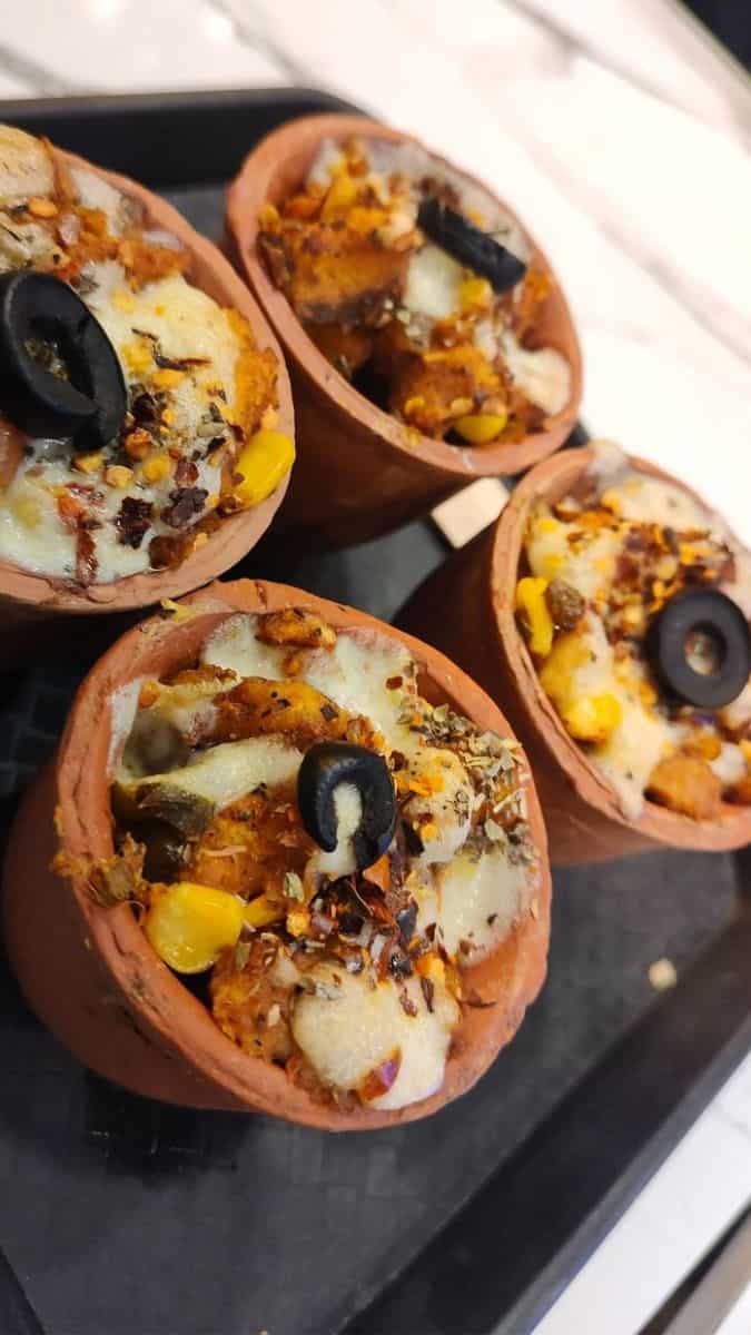 4 small kulhads (clay cups) 4 tbsp pizza sauce 1 cup grated mozzarella cheese ½ cup chopped onions ½ cup chopped capsicum ¼ cup sweet corn (boiled) ¼ tsp red chilli flakes ¼ tsp oregano or mixed herbs 2 tbsp olive butter or softened butter 4 bread slices or pizza base pieces (crumbled)