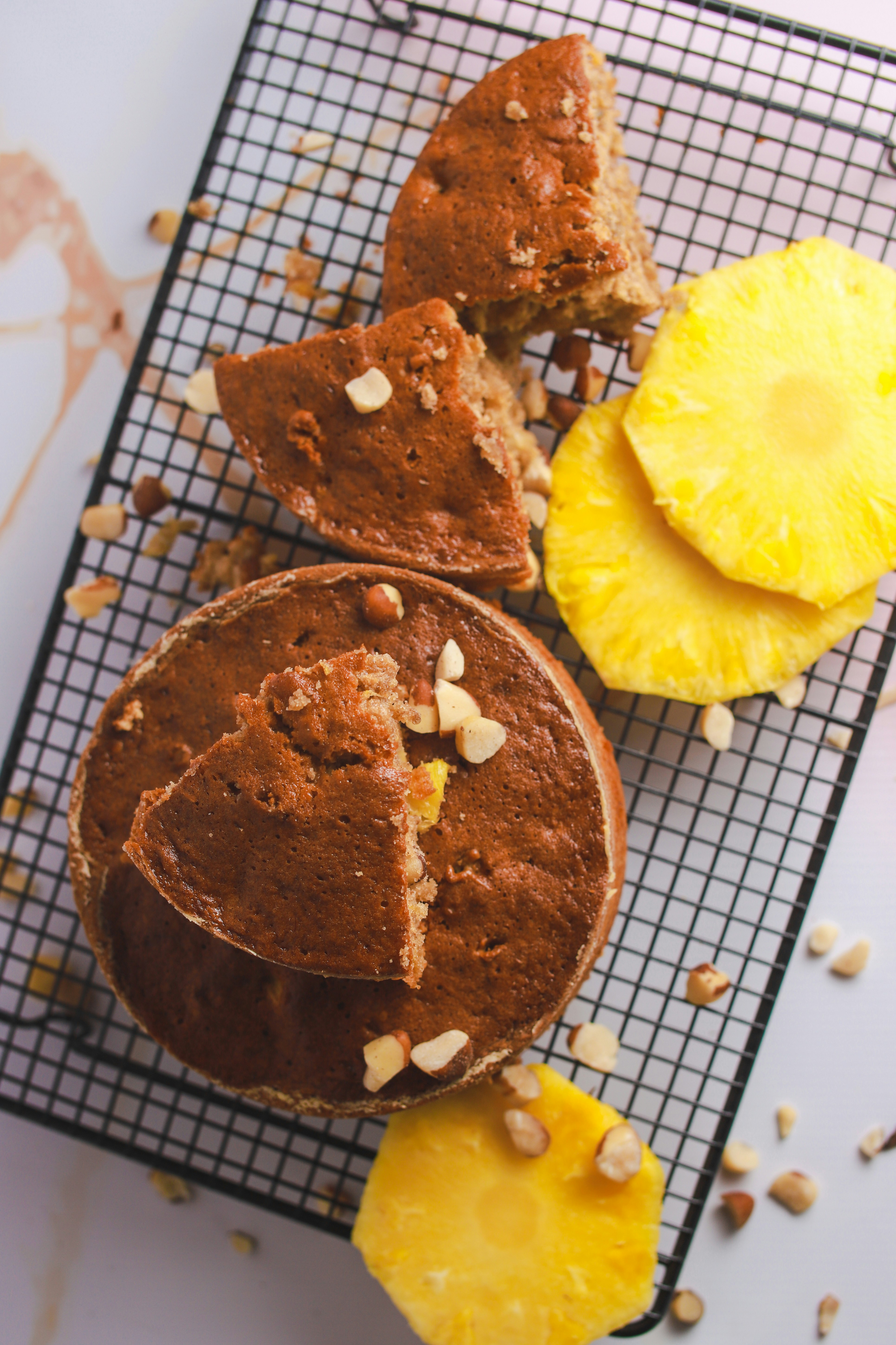 The upside-down pineapple cake features caramelised slices on the bottom of a soft vanilla cake.
