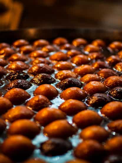 Divide the dough into small balls and deep -fry in hot oil. Soak the ball in the sugar syrup.
