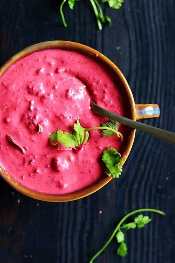 Have you tried pink beetroot raita? It is a refreshing addition to Indian meals. It is slightly sweet and boasts the robustness of mustard seeds and curry leaves. Try this recipe, and you will make everyone a fan of your cooking.