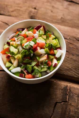 Kachumber salad relies on very finely chopped vegetables so each spoonful feels balanced and refreshing. The lemon dressing is light and meant to coat the ingredients without weighing them down. Fresh coriander adds a soft herb note that makes the salad feel bright and clean. It pairs naturally with Indian meals, especially richer curries or dals.