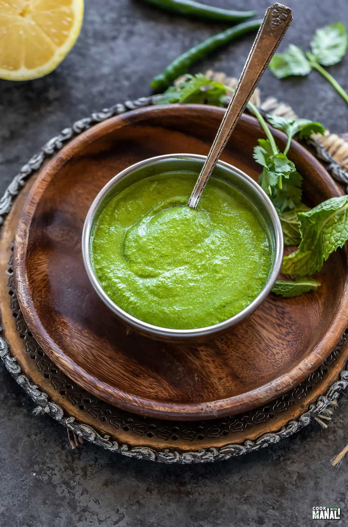 1 cup mint leaves ½ cup coriander leaves 1 green chilli ½ tsp cumin Salt and lemon juice