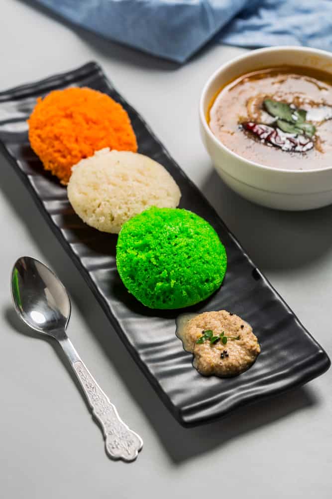 Make three batches of idli of orange, white, and green colours. Arrange them as the national flag and serve.