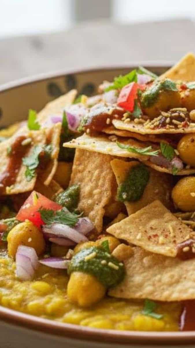 Rishikesh-style dal ki chaat is warm, tangy, and lightly spiced street food. Prepared with yellow dal and sharp chutneys, it’s comforting and also light.