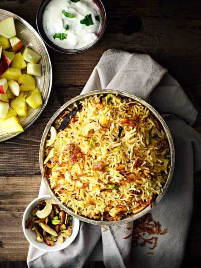 Kashmiri pulao is an aromatic rice dish cooked in ghee and saffron, layered with nuts, dry fruits, and pomegranate seeds. Its mild sweetness and delicate flavours make it a royal delight.