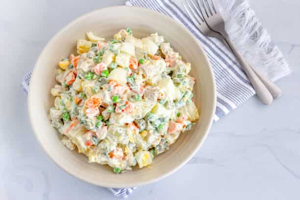 Russian Salad is a cold, creamy dish made with fruits, boiled vegetables, and mayonnaise, served as a party favourite starter or side.