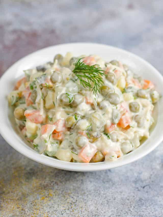 Russian salad blends soft potatoes, peas and carrots with a creamy, mildly tangy dressing that feels both comforting and refreshing. The vegetables stay tender without turning mushy, giving the salad a pleasant bite. It’s a versatile dish that works as a chilled side, a snack or even a sandwich filling.