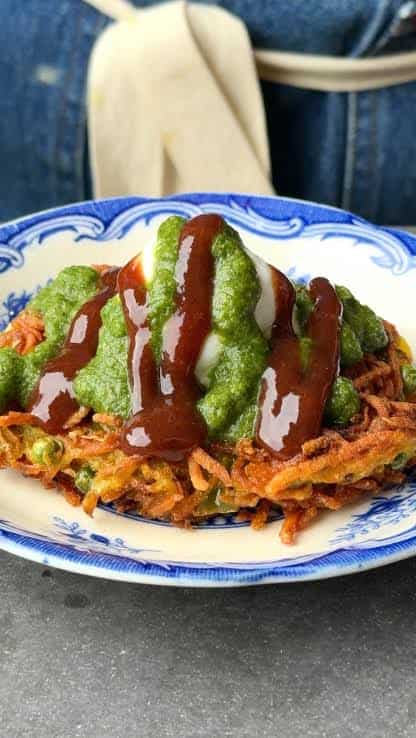 Samosa latkes bring together the Hanukkah tradition of frying potato pancakes with the familiar spice profile of an Indian samosa. Grated potatoes are seasoned with cumin, coriander and chilli, then fried until crisp and deeply golden. Serving them with green chutney and tamarind chutney instead of sour cream gives the dish its viral appeal. They work well as a festive appetiser or as part of a Hanukkah spread.