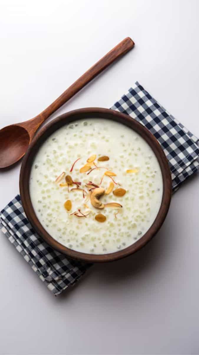 Sabudana fheer is creamy and aromatic, made with tapioca pearls, milk, and cardamom. Make this kheer by boiling soaked sabudana in milk, adding sugar and cardamom. Simmer till creamy and pearls turn translucent. This makes for a comforting dessert perfect for Sawan fasting rituals.