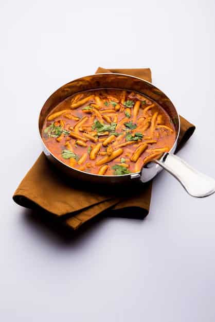 Just before serving, add sev to the curry and simmer for 1–2 minutes (don't overcook or sev will become mushy).
