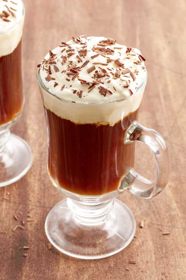 ½ cup freshly brewed coffee, hot 1 ½ tsp granulated sugar 1 heaping teaspoon of brown sugar 4 tbsp Irish whiskey Fresh whipped cream