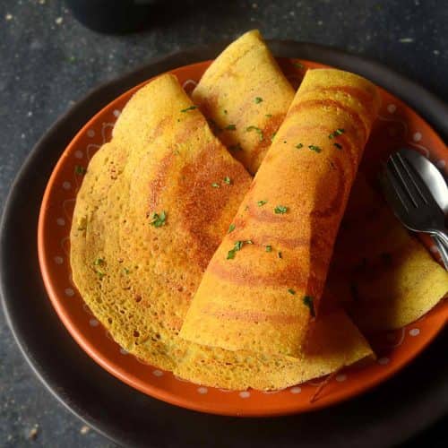 Transfer the moong dal dosa to a plate and serve with chutney or sambar.