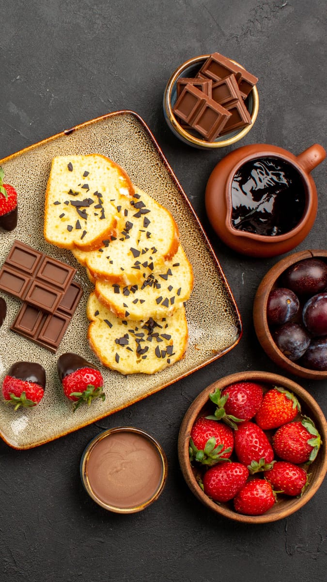 A spiced chocolate fondue board features a perfect combination of the warm spiced chocolate dip and fresh fruits, nuts, cheese, cookies, and more. Served in a pot, the rich chocolate fondue is the heart of the fondue board that sets the perfect mood on a cold winter evening.
