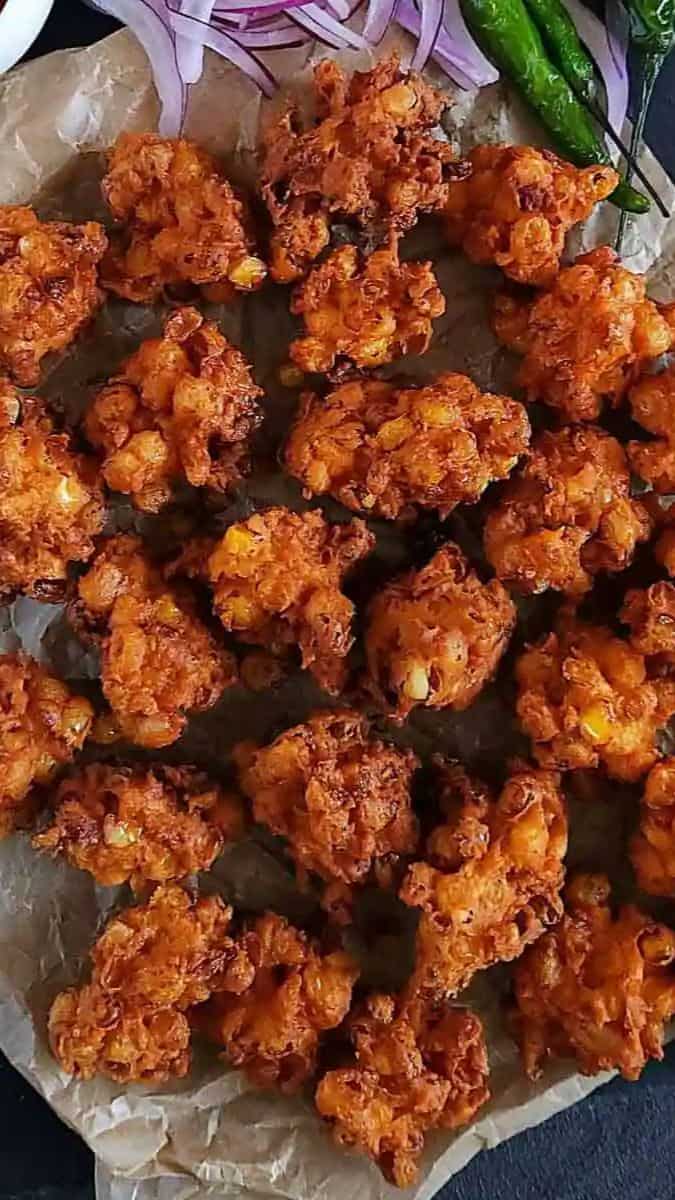 1 cup sweet corn kernels 1/2 cup besan 2 tbsp rice flour 1/4 cup chopped onion 1-2 green chillies 1/2 tsp ginger-garlic paste 1/2 tsp cumin powder 1/4 tsp turmeric powder A pinch of hing 1/4 cup coriander leaves Salt to taste Water as needed Oil for deep-frying