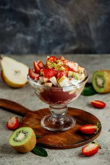 Chilled fresh cream folds gently around sweet mangoes, crisp apples, and bursts of juicy grapes, creating a spoonful that’s smooth, fruity, and lightly sweet. Every bite feels cool, creamy, and refreshing without being heavy or overly sugary.