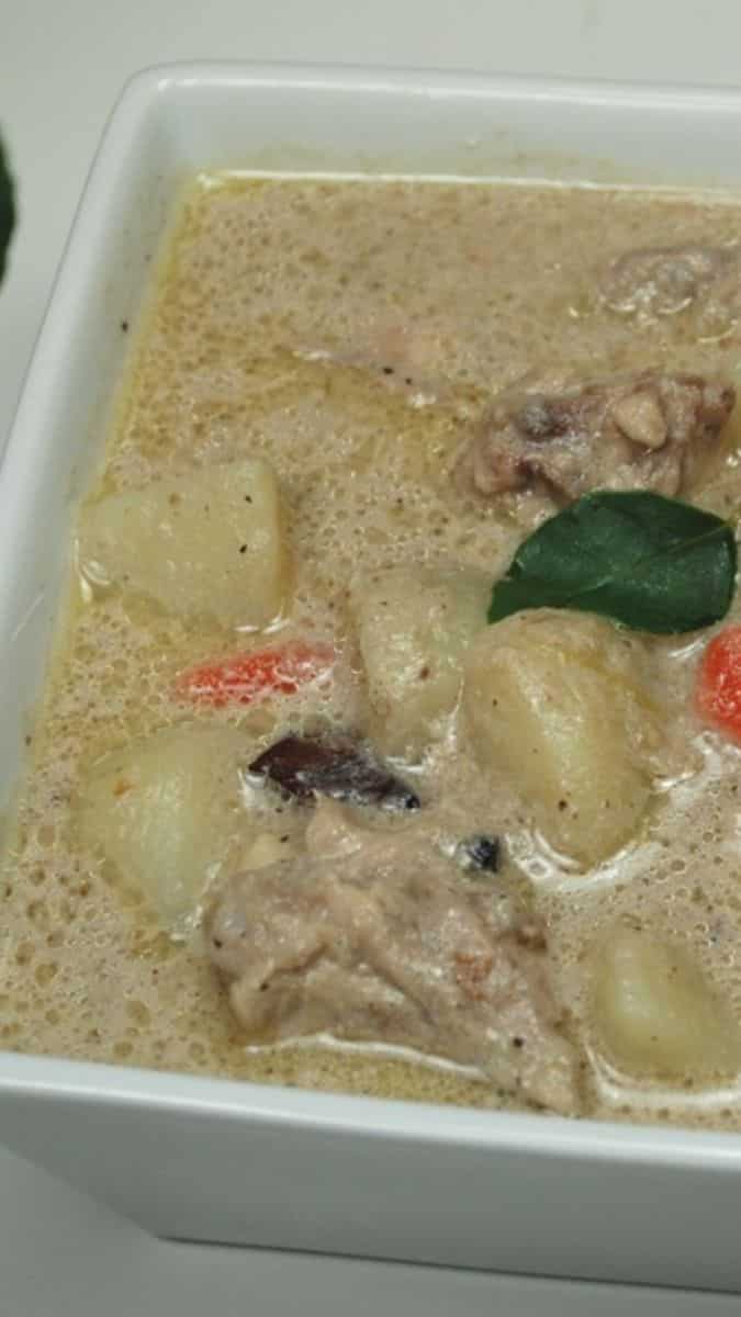 600g chicken 250g baby potatoes 250g baby onions 250g regular onions 250g carrots 250g beans 250g green papaya 4 pcs bay leaves 5g white pepper 15g ginger 75g butter 150g milk 30g maida 18g salt 3 cups water ½ tsp MSG