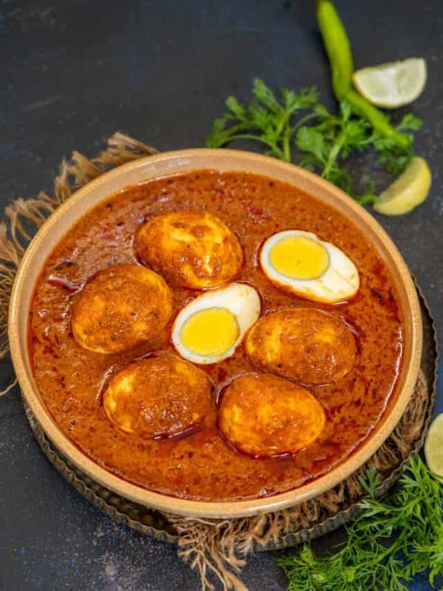 This egg curry, with a moderate amount of spices and cooked in a pressure cooker, yields a perfect gravy. Add the sweetness of jaggery and the sourness of tamarind, and there is a finger-licking delight for dinner!