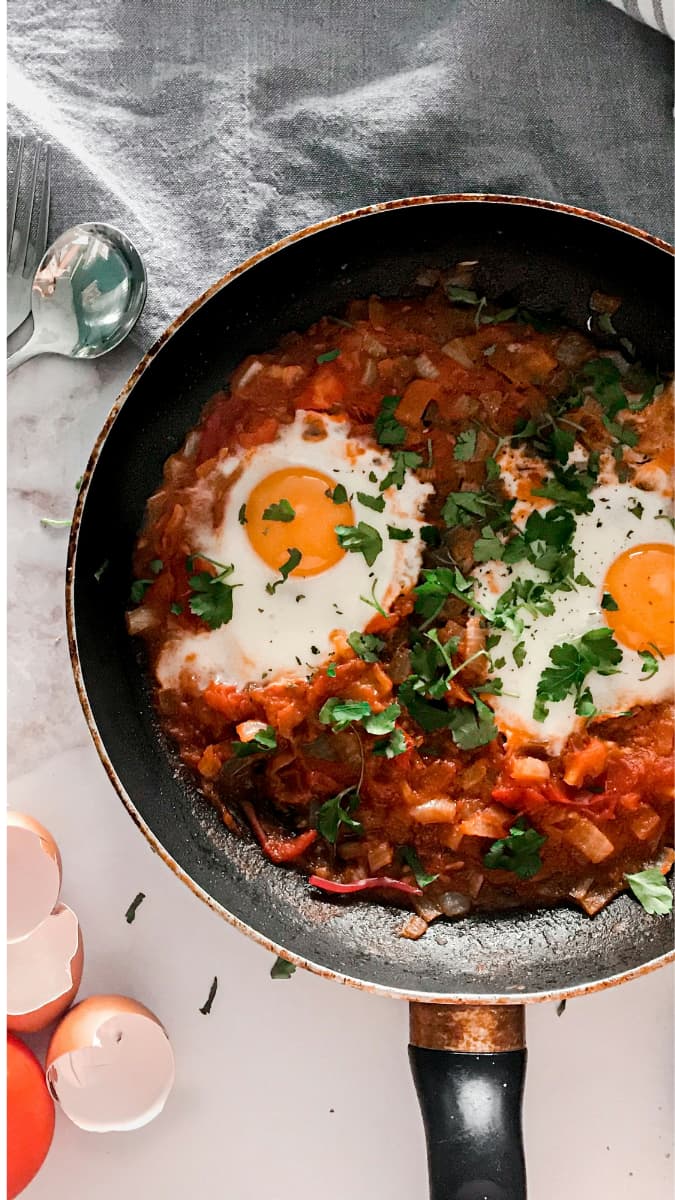Shakshuka originated in North Africa and became a staple breakfast across the Middle East due to its simplicity and strong flavours. The dish is built around eggs poached in a spiced tomato base, making it naturally high in protein and suitable as a hearty start to the day.