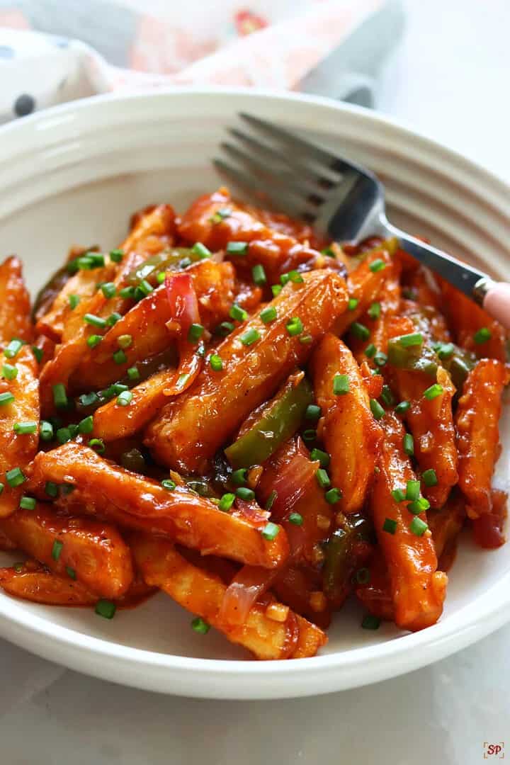3 potatoes (cut into fingers) 3 tbsp cornflour 2 tbsp maida (all-purpose flour) 1 tsp soy sauce 1 tbsp tomato ketchup 1 tbsp red chilli sauce 1 tsp vinegar 1 tsp finely chopped garlic ½ tsp chopped ginger 1 cubed onion ½ cubed capsicum 2 slit green chillies Salt & black pepper to taste Oil for frying Spring onions for garnish