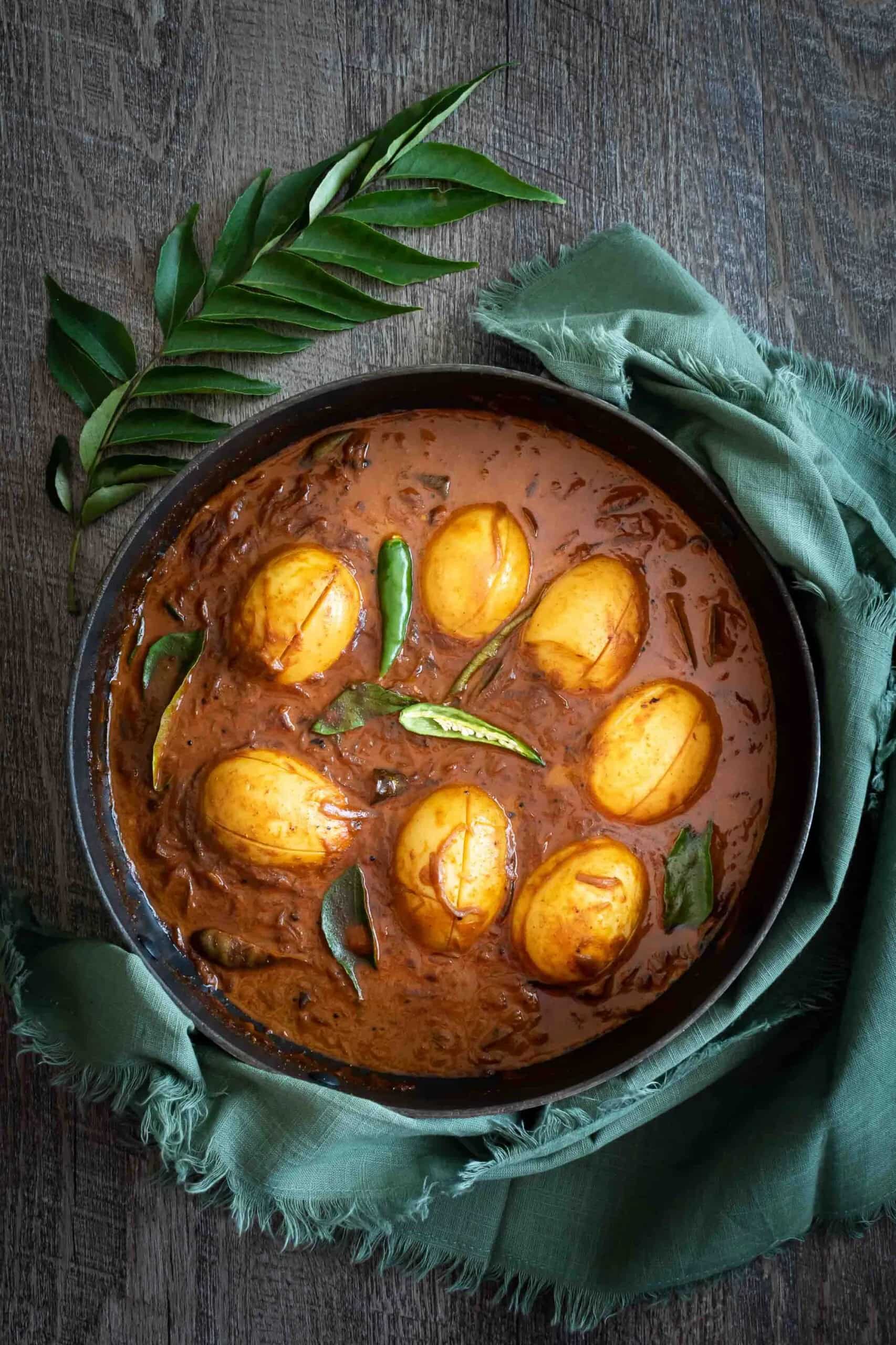 Boiled eggs, simmered in spicy onion and tomato gravy, and served with rice or roti.