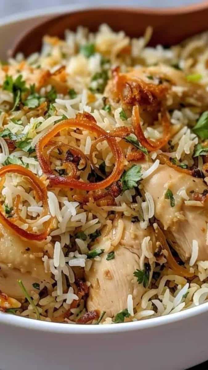 500 grams of chicken 2 cups of soaked basmati rice 2 thinly sliced onions 2 tbsp ghee 1 tbsp ginger garlic paste 1 tsp red chilli powder ½ tsp turmeric powder Whole spices, as needed Salt to taste Fried onions, for garnish Dry fruits, for garnish