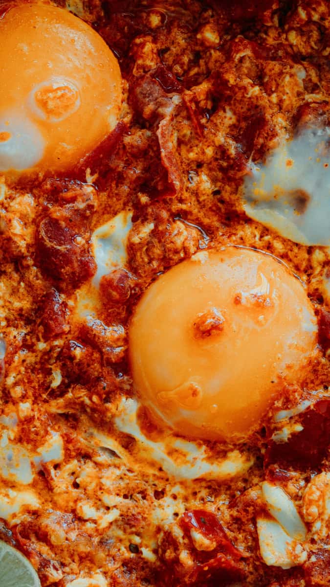Place the poached eggs over the yogurt, drizzle with the spiced chili butter, and garnish with fresh herbs.