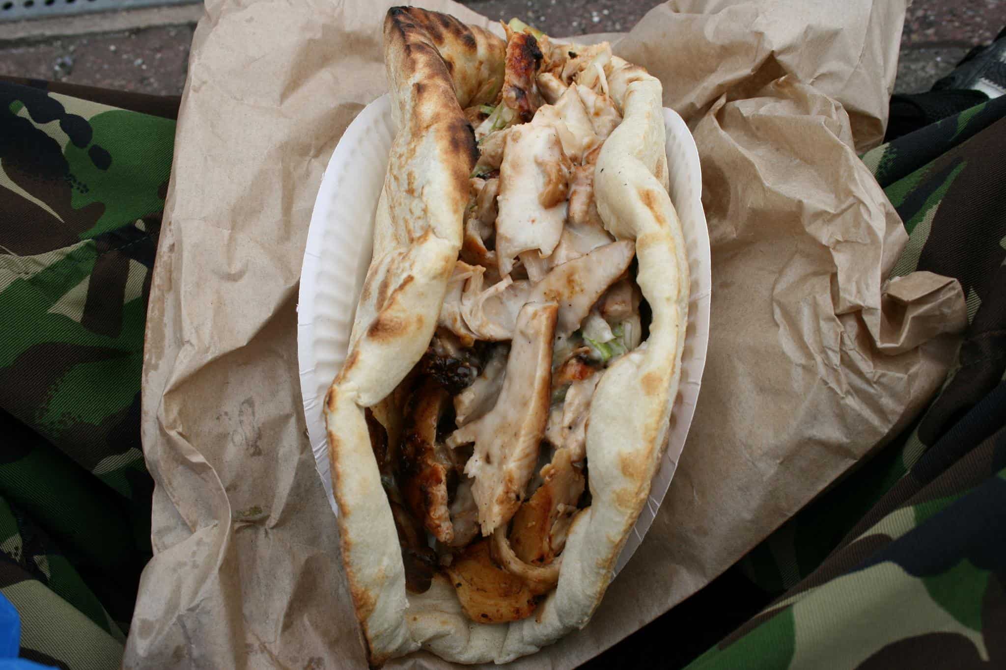 450 grams minced mutton 1 grated onion 4-5 garlic cloves, minced 1.5 teaspoons paprika 1 teaspoon oregano ¼ cup yoghurt 1 tablespoon olive oil Salt, to taste 2 pita breads, toasted 1 tomato, sliced 1 onion, sliced 1 cucumber, diced 2 teaspoons garlic aioli