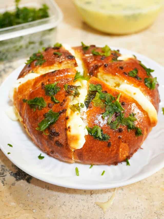 The Korean cream cheese garlic bun is known for its rich contrast of flavours and textures. Soft milk bread is cut into segments, filled with mildly sweet cream cheese, and soaked in a garlicky butter mixture that bakes into every layer. It is usually eaten warm as a bakery-style snack rather than a side dish.