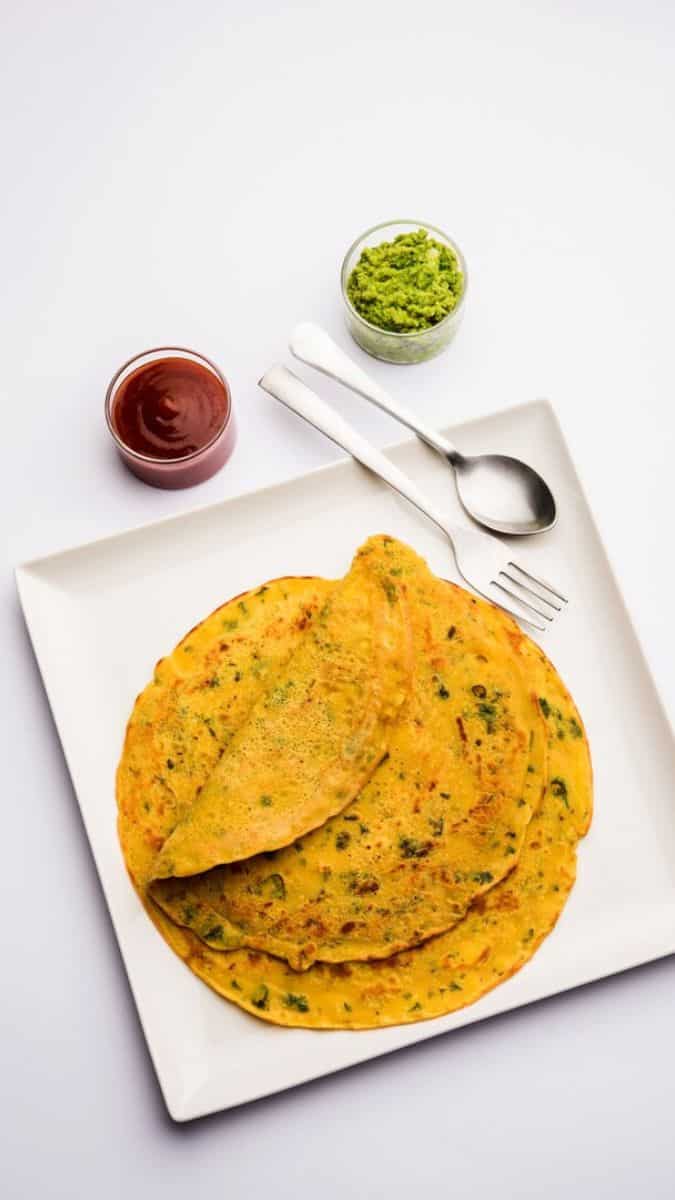 1 cup gram flour (besan) ¼ tsp turmeric ½ cup chopped onion, tomato, and spinach ½ tsp cumin seeds Salt and pepper to taste Water and oil as needed